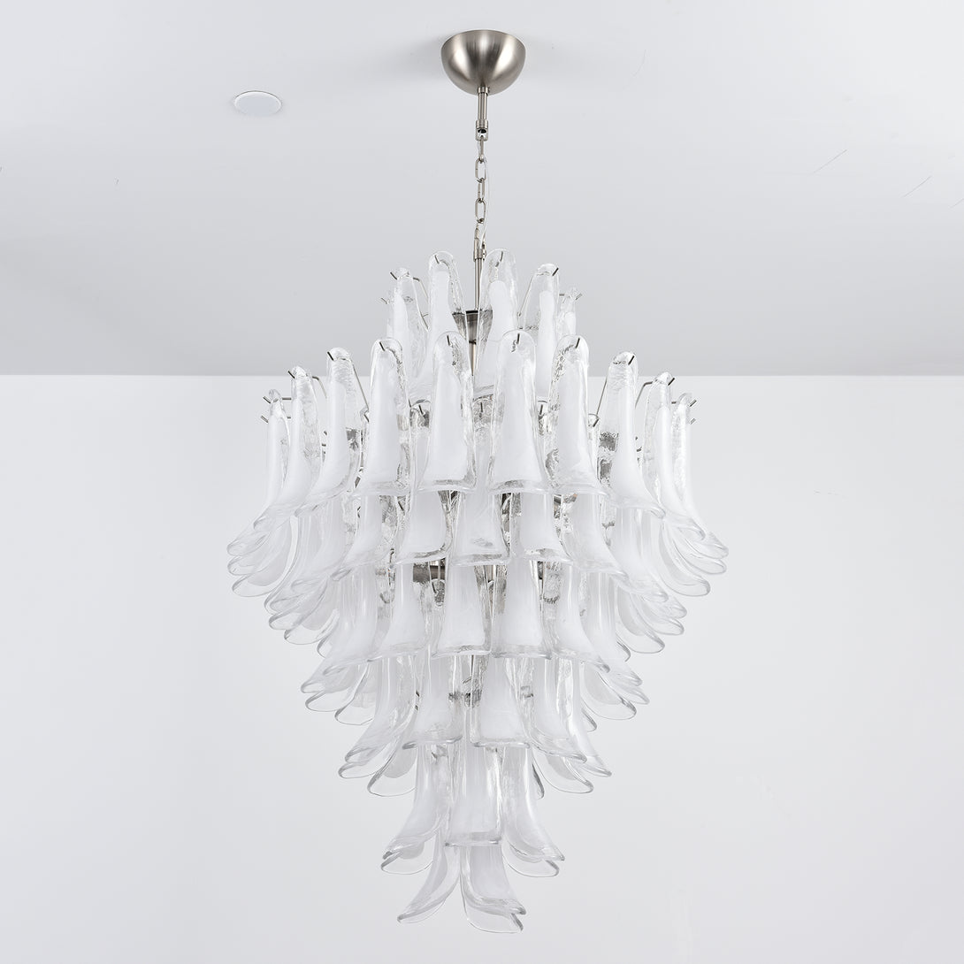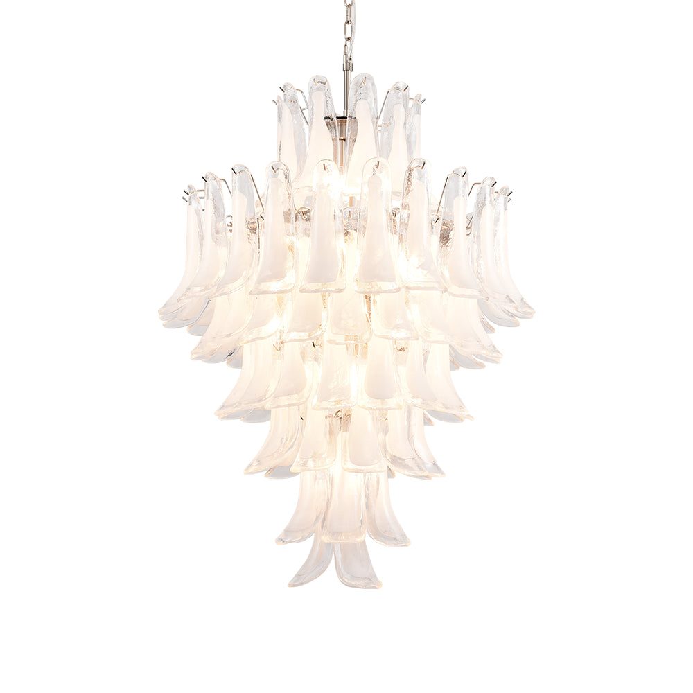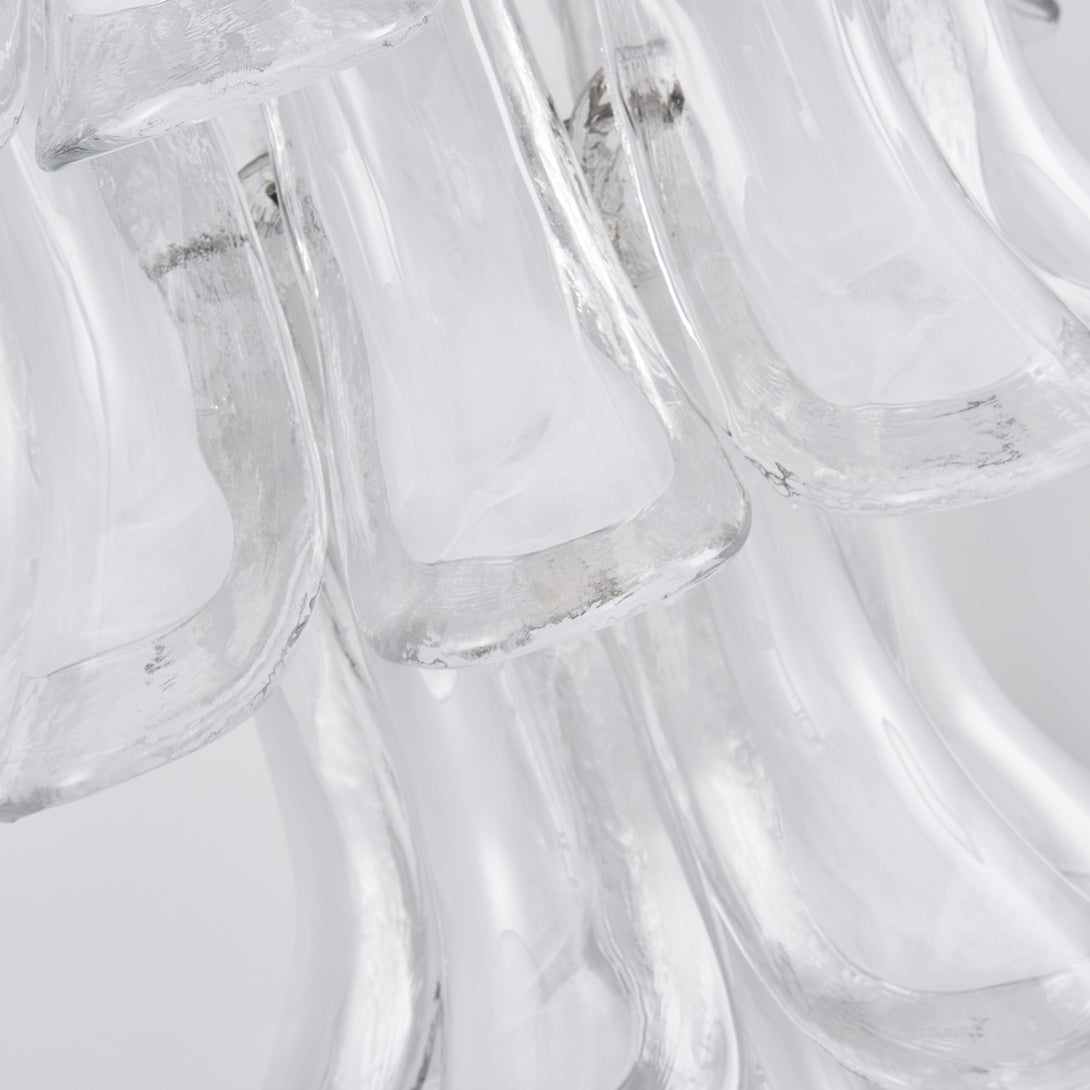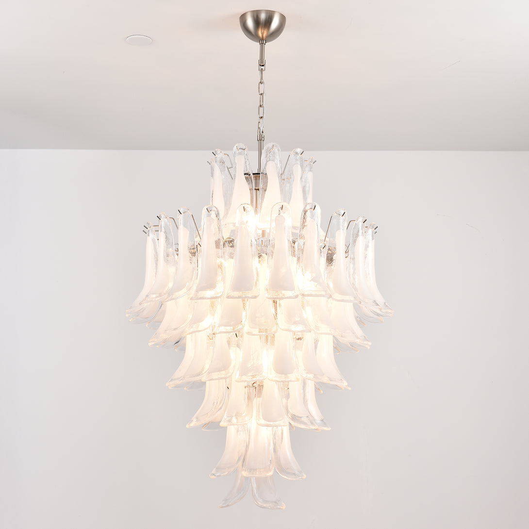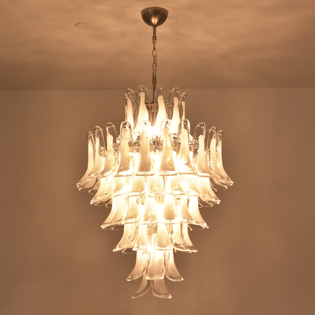 Stunning Murano White Glass Petals Chandelier. This is a tribute to traditional aesthetics, crafted with today's precision and elegance. Consisting of large hand-blown glass petals, this chandelier is a work of art of abstract shapes and colors. The white, caramel and clear glass are combined in a unique way that adds a sublime and modern aesthetic to any room. Let this chandelier be the radiant centerpiece of your home and create a mood of timeless beauty and sophistication.