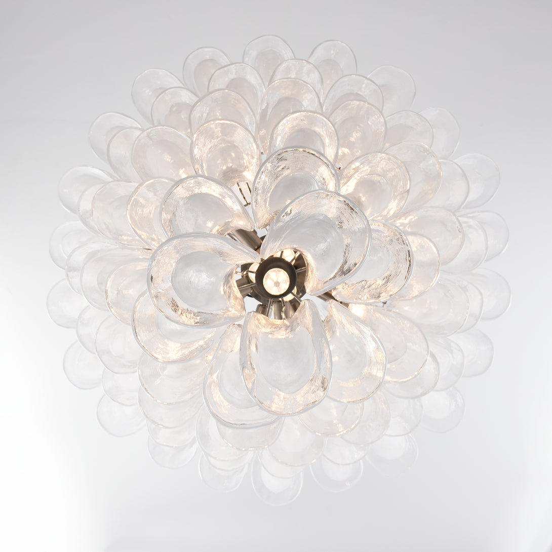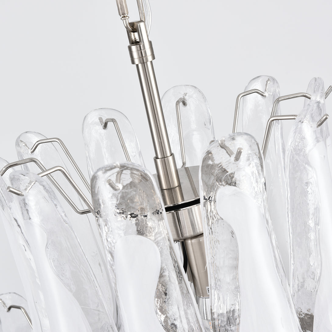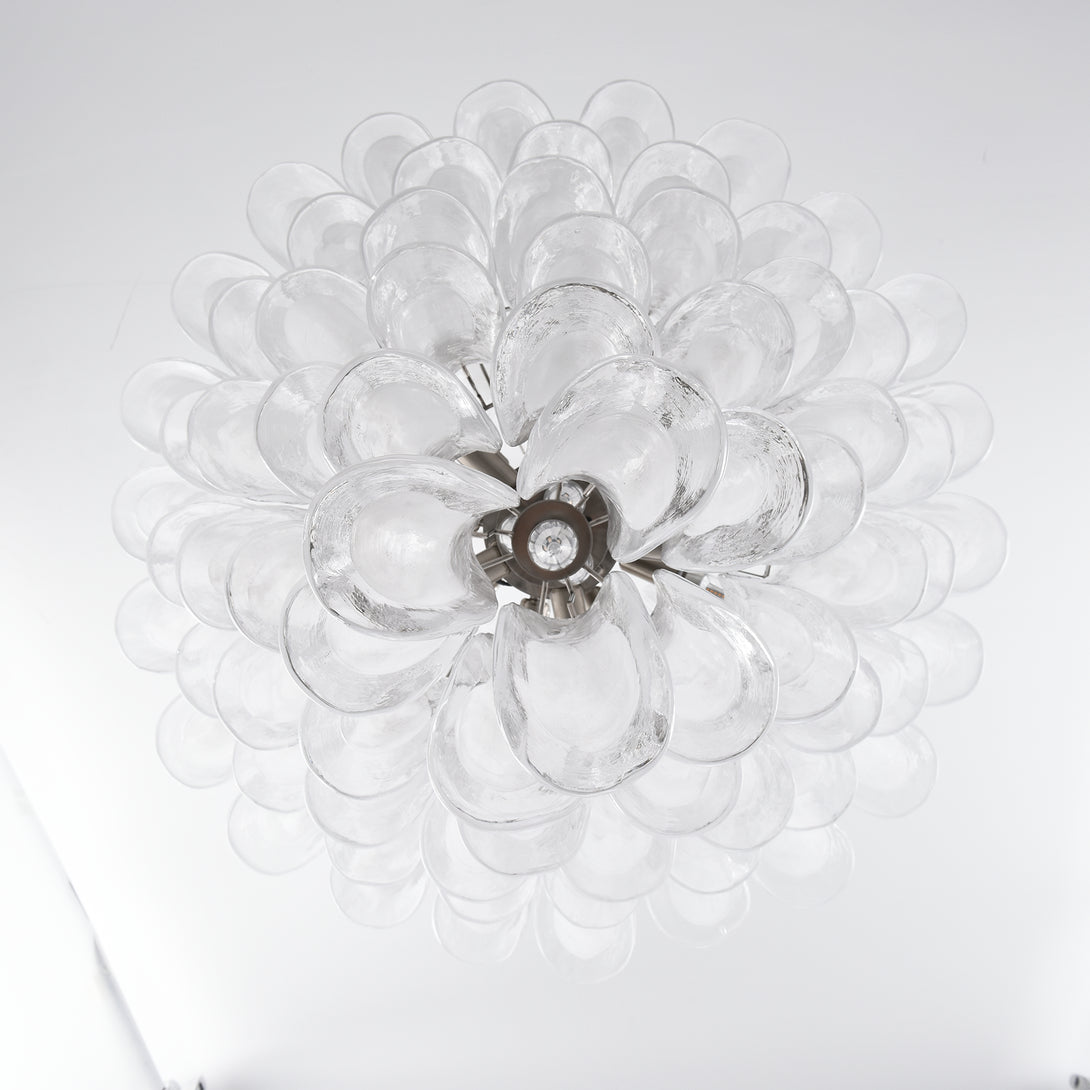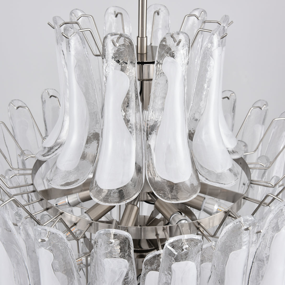 Stunning Murano White Glass Petals Chandelier. This is a tribute to traditional aesthetics, crafted with today's precision and elegance. Consisting of large hand-blown glass petals, this chandelier is a work of art of abstract shapes and colors. The white, caramel and clear glass are combined in a unique way that adds a sublime and modern aesthetic to any room. Let this chandelier be the radiant centerpiece of your home and create a mood of timeless beauty and sophistication.