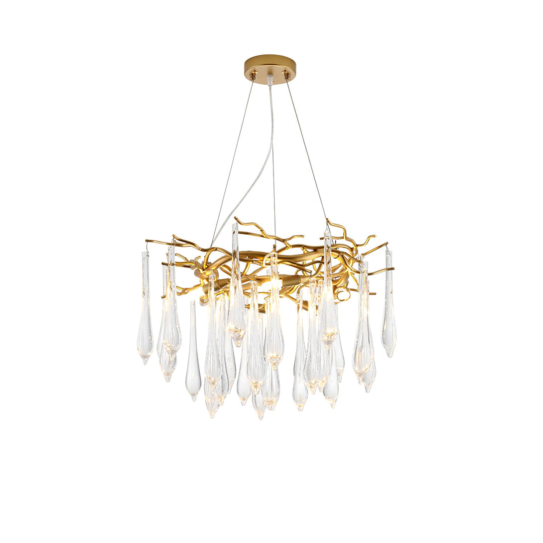 A mesmerizing statement that will inspire awe from above, the fitting features organically formed brass branches dripping with teardrop shapes of handblown glass. Crafted so that it plays with light in an enchanting manner, the chandelier would command attention in a contemporary space.
