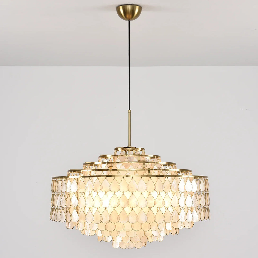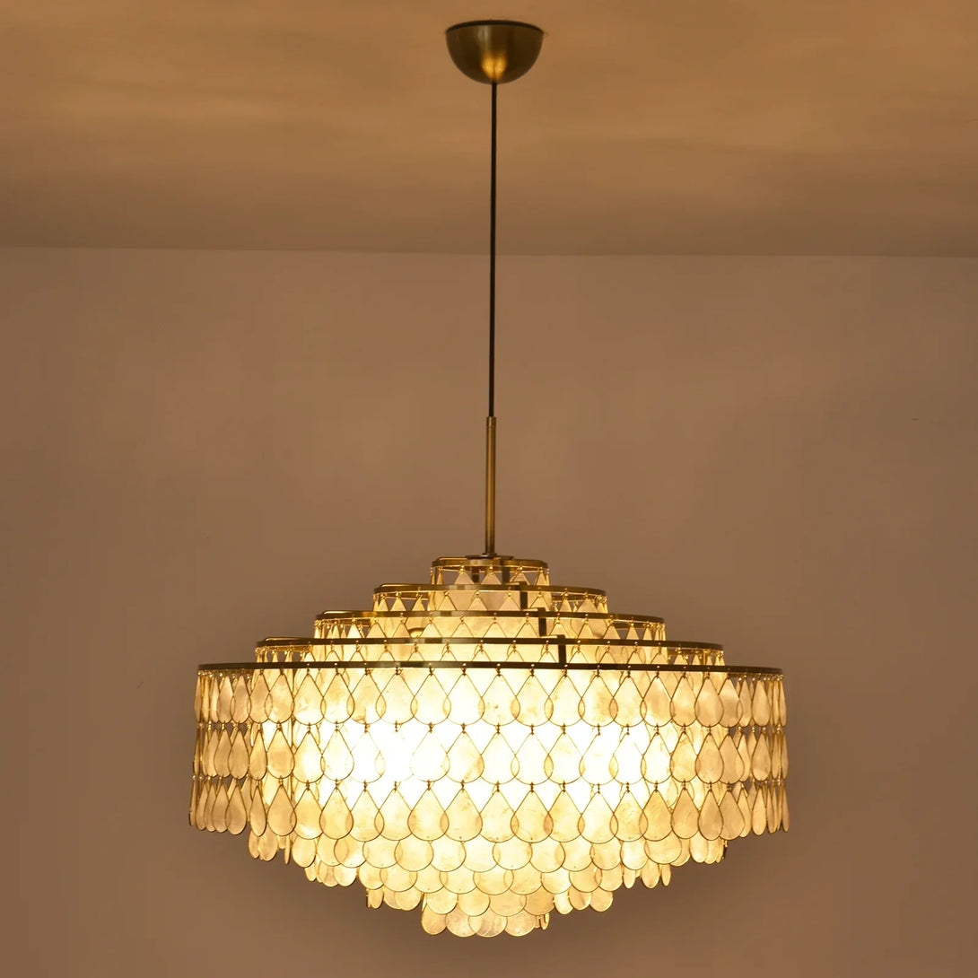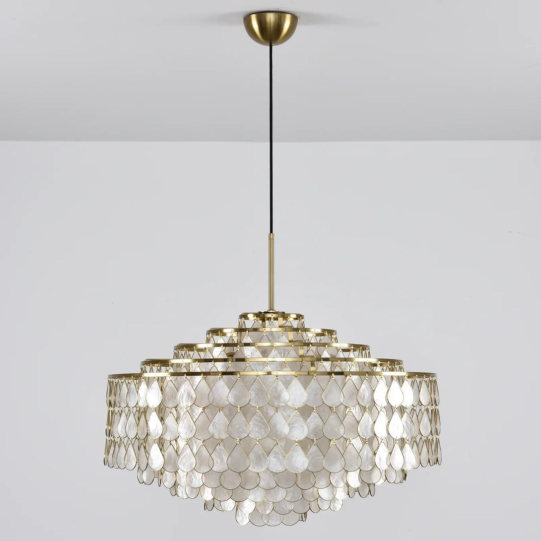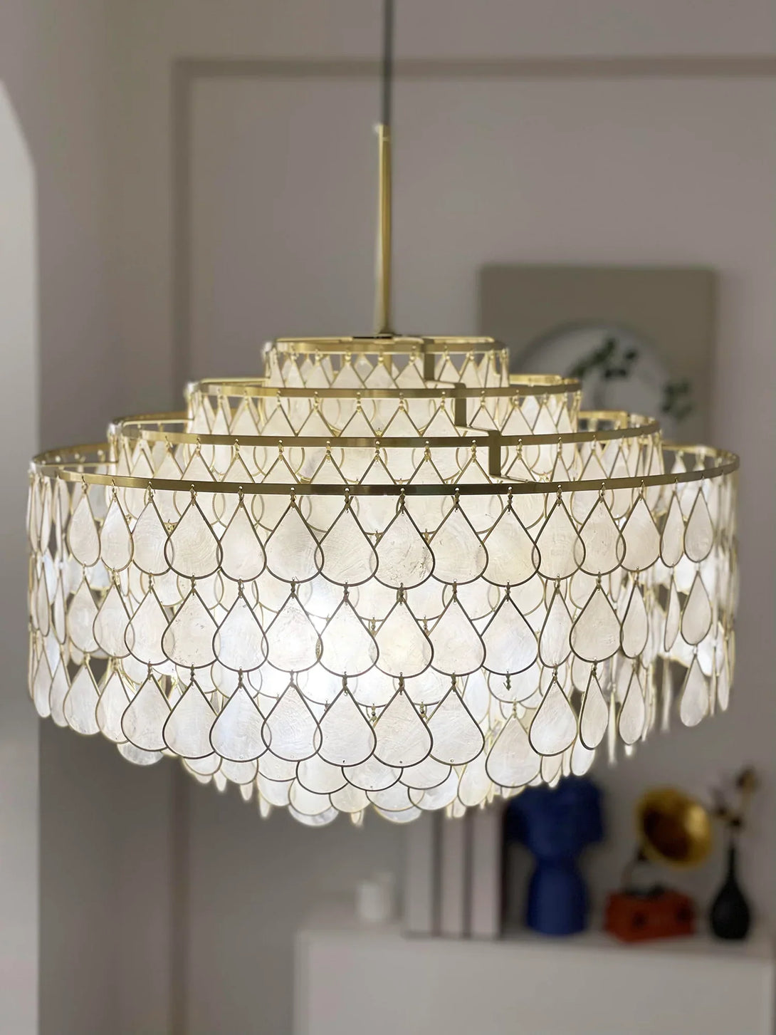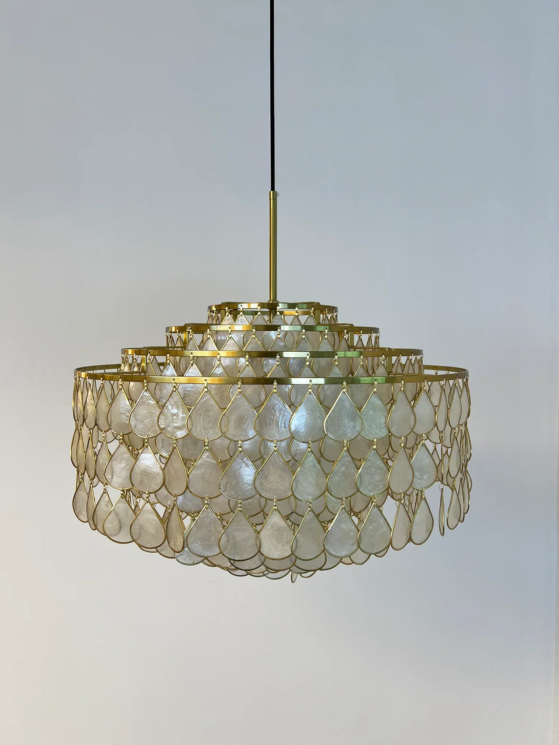 The Shell Teardrops Pendant Light features a gold body and elegant shell embellishments, combining sophistication with luxury. Add a touch of elegance to any space. Let its warm glow and sophisticated design elevate your home decor.