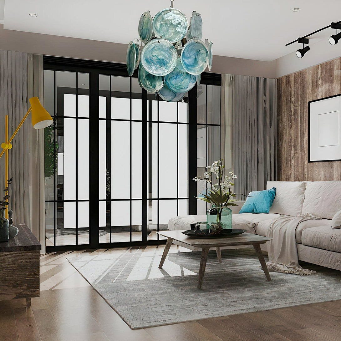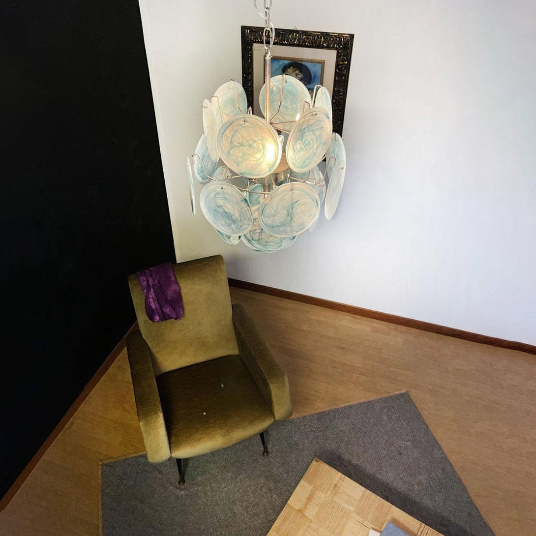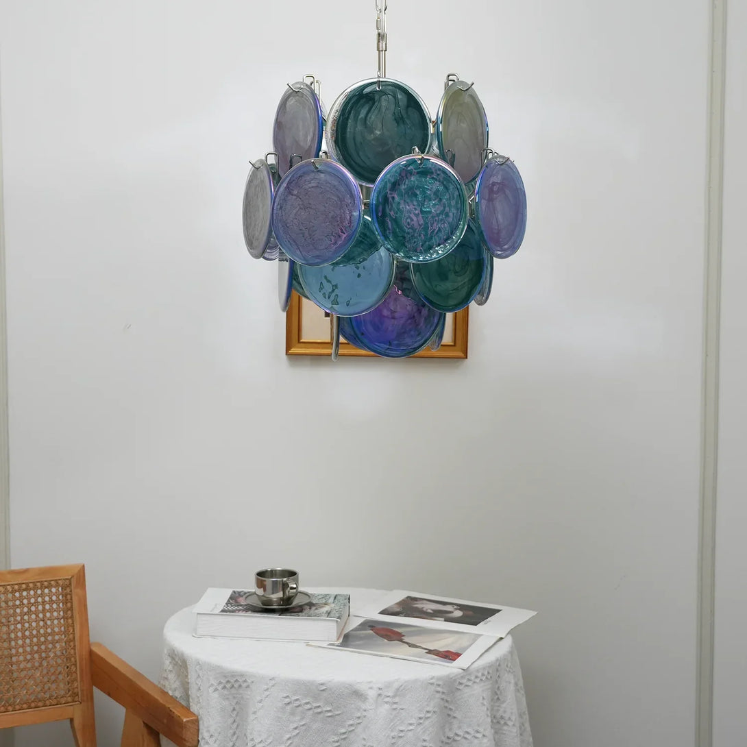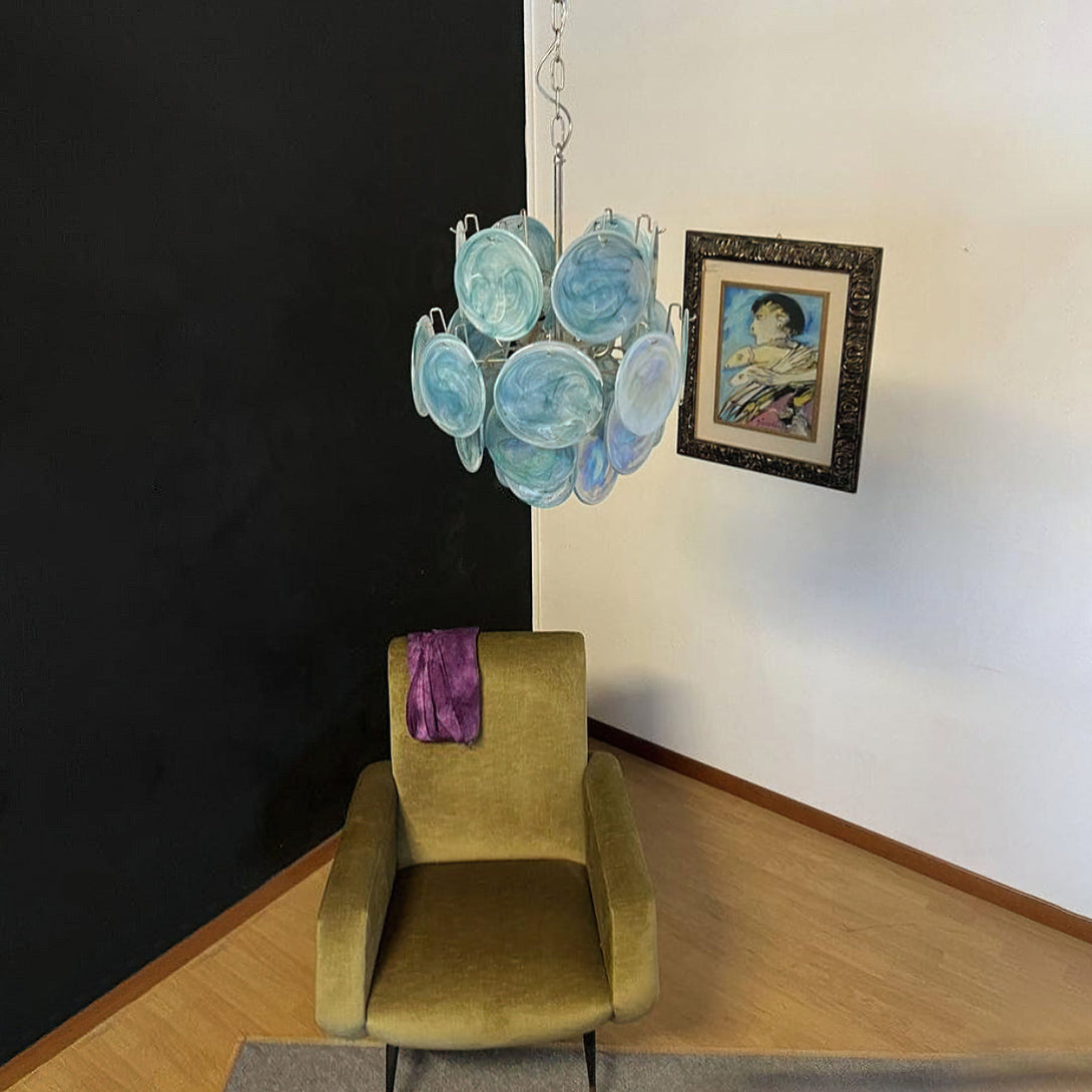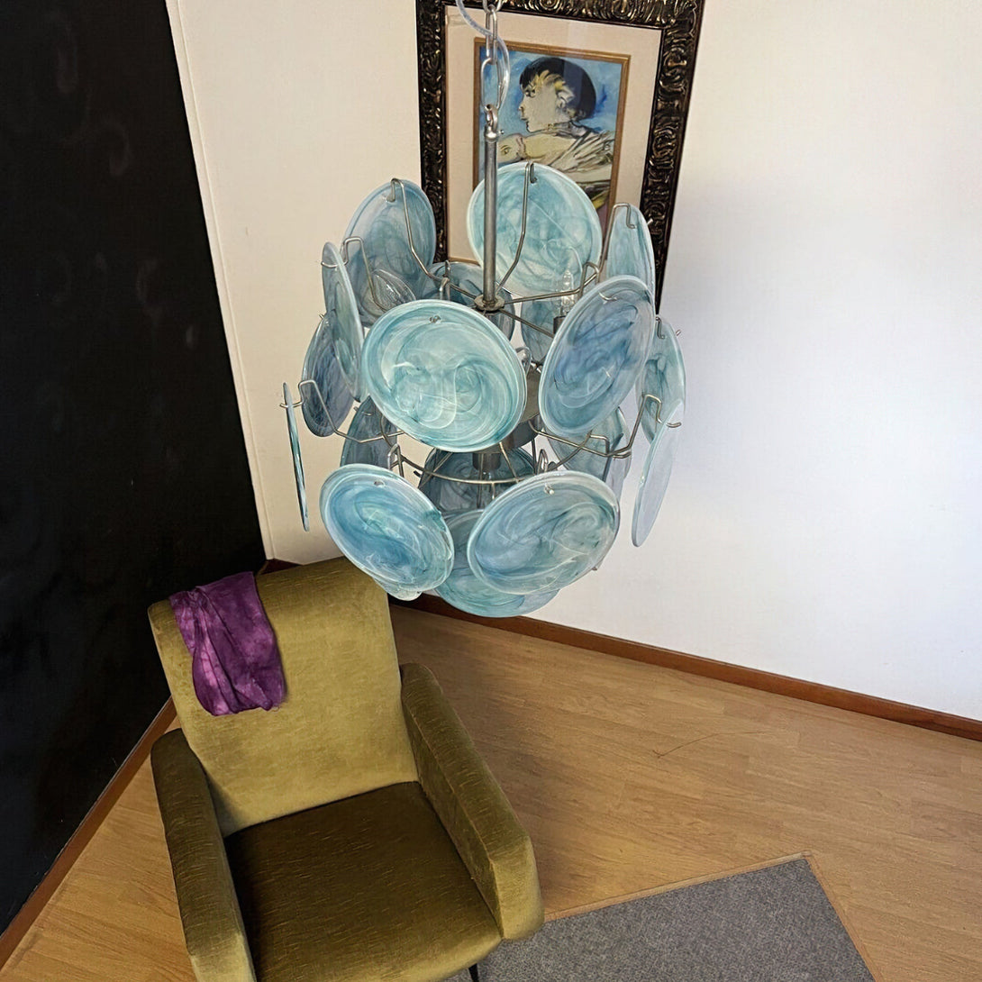 Elevate your space with our Vintage Murano Blue Glass Chandelier. This dazzling piece features Blue disks that reflect a spectrum of colors, transforming any room into an exquisite masterpiece. With its vintage charm and iridescent glasses, this chandelier will add style and sophistication to your home.