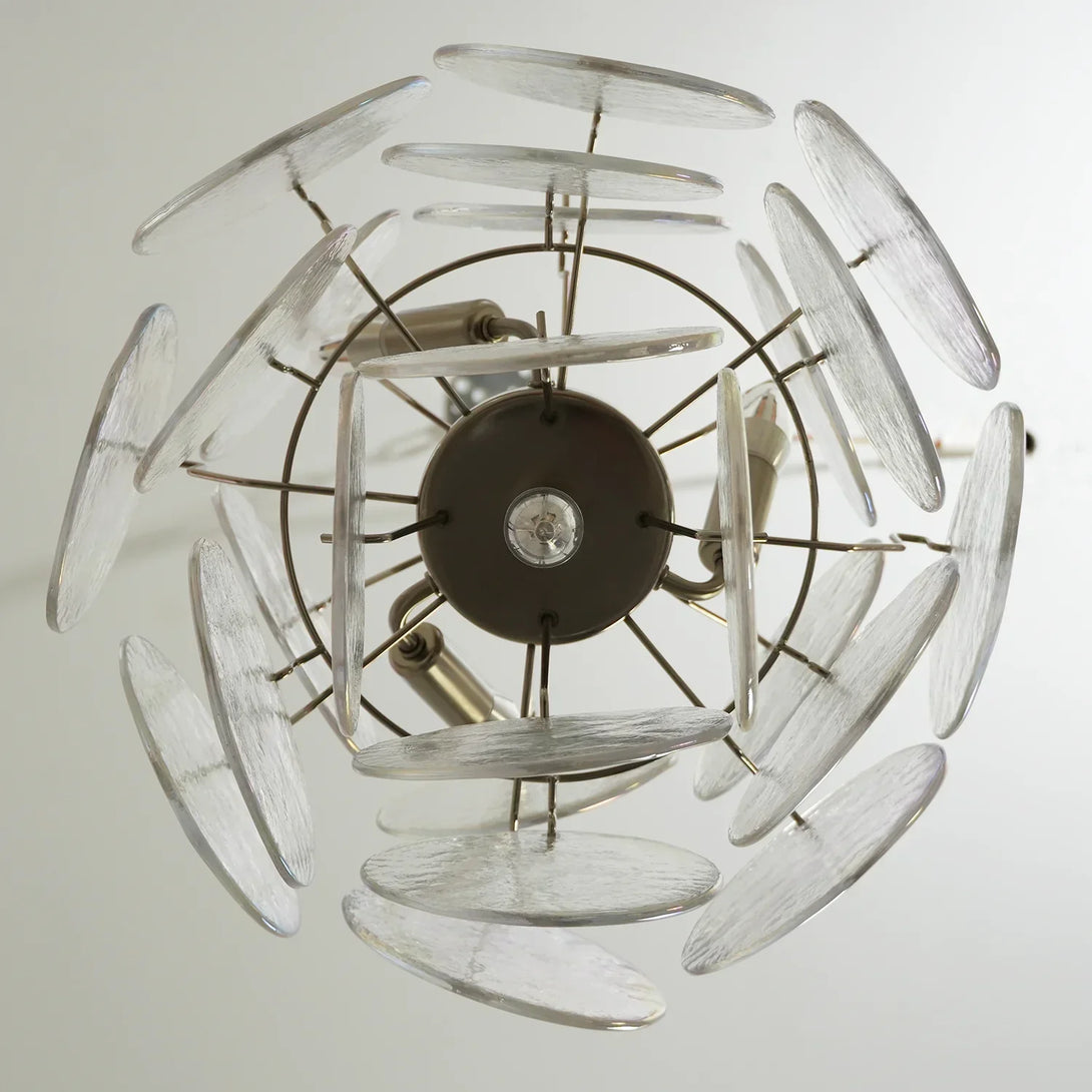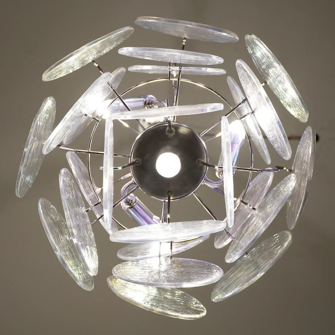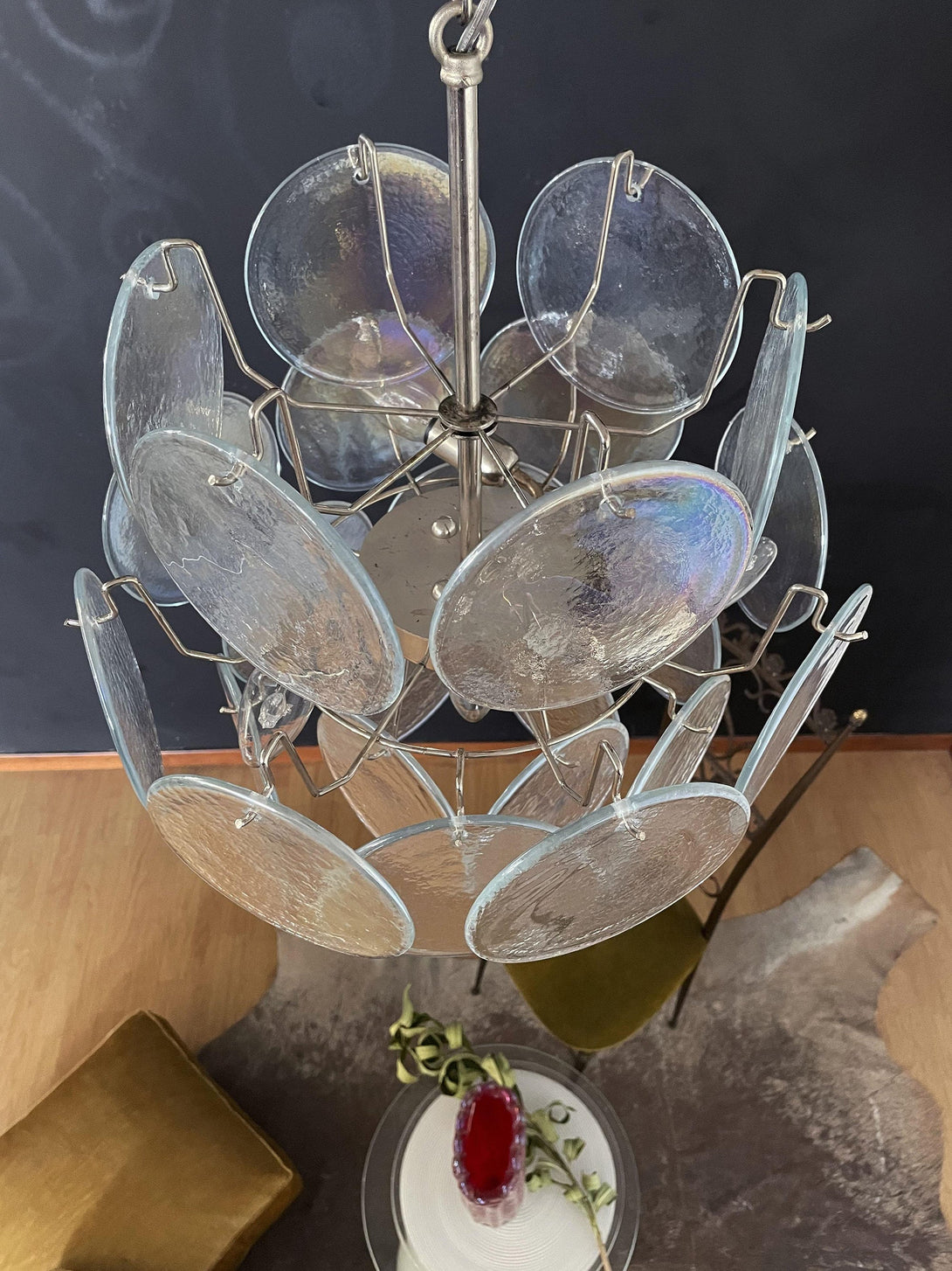 Elevate your space with our Vintage Murano Iridescent Glass Chandelier. This dazzling piece features MIridescent clear disks that reflect a spectrum of colors, transforming any room into an exquisite masterpiece. With its vintage charm and iridescent glasses, this chandelier will add style and sophistication to your home.