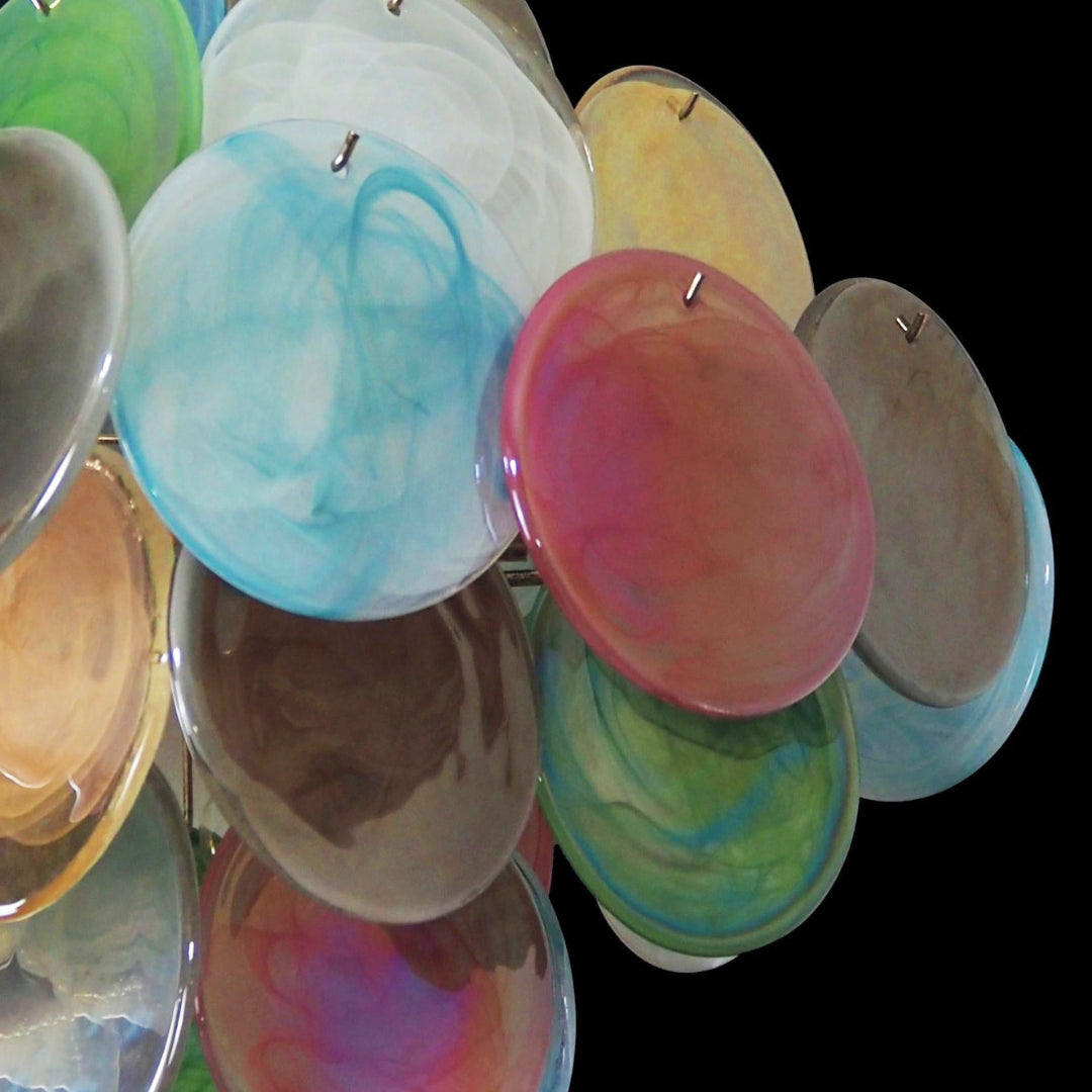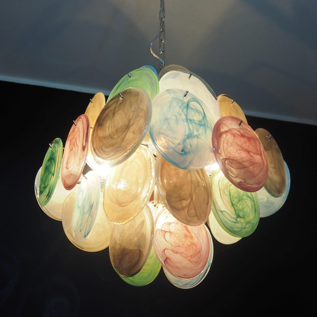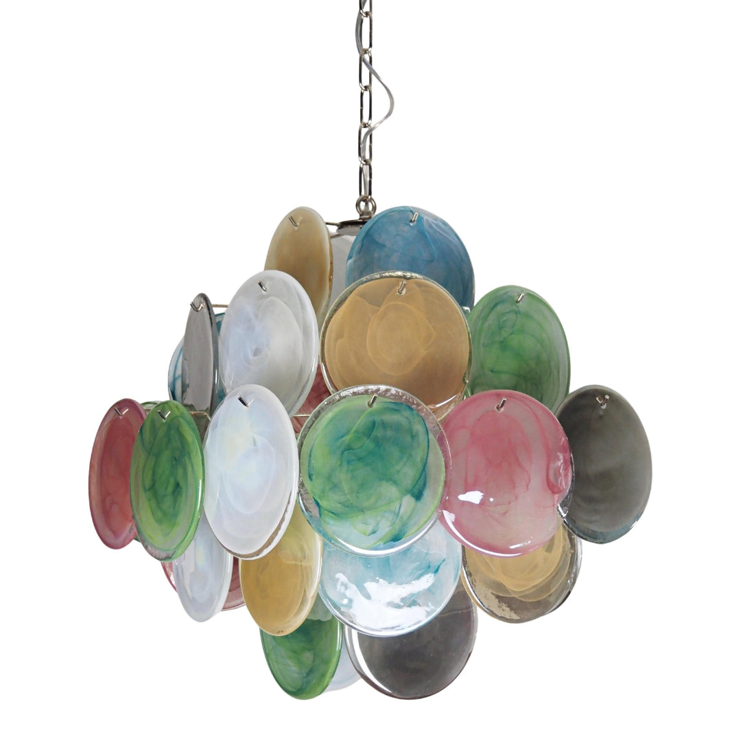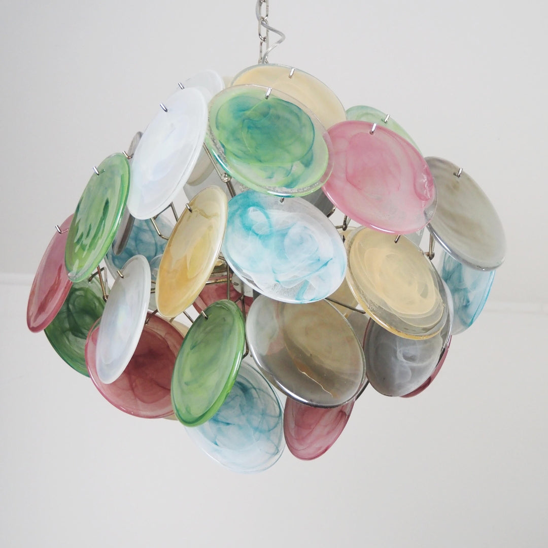Vintage Murano Multicolored Disks Chandelier. The chandelier has fantastic iridescent alabaster Colorful discs in a nickel metal frame. This chandelier is more than just a lighting fixture, it's a work of art that illuminates your surroundings.
