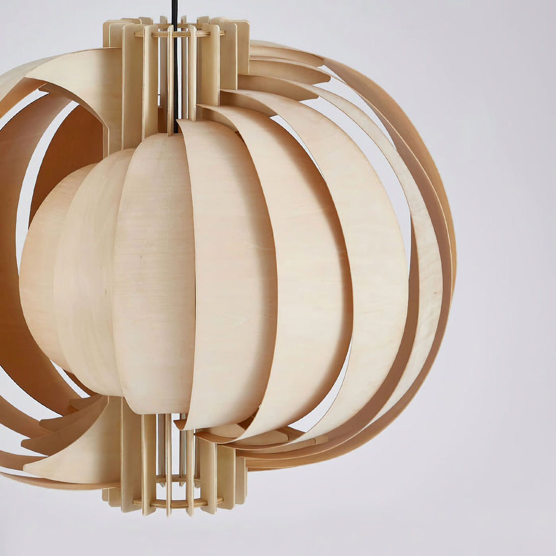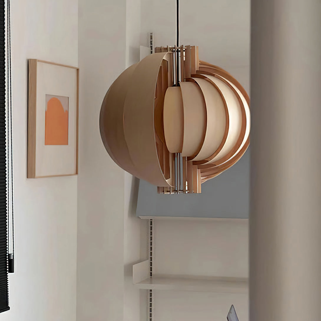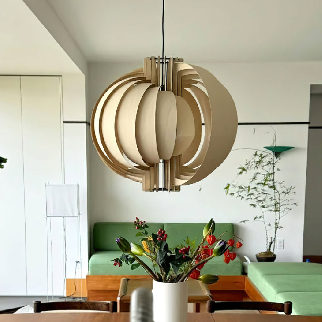 This elegant Wooden Lantern Pendant Lamp from korewolamp is a stunning example of minimalist design. The spherical shade is crafted from a series of curved, light wood slats that create an open, airy structure. When lit, the light filters through the gaps and the thin wood panels, casting a warm and inviting glow. The simple black canopy and cord provide a modern contrast to the natural wood tones. Its clean lines and natural materials make it a perfect fit for Scandinavian, minimalist, or contemporary interior styles.