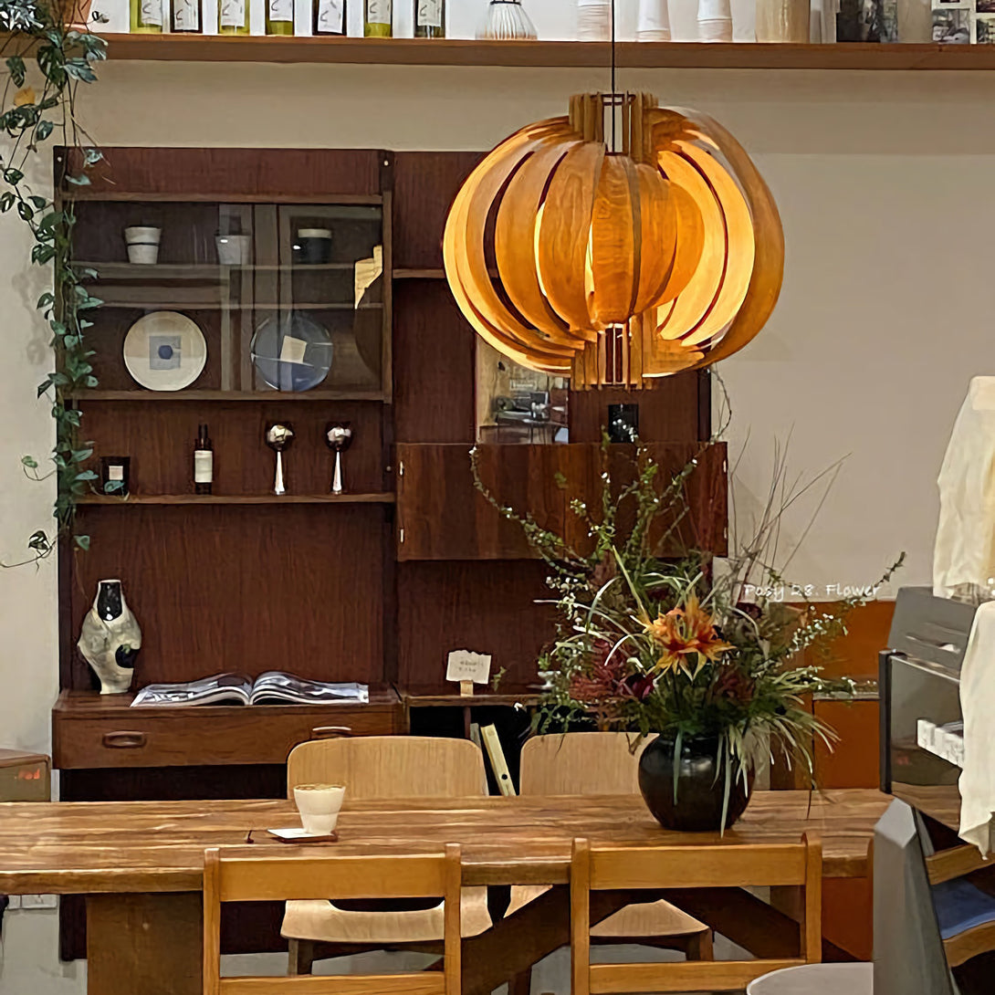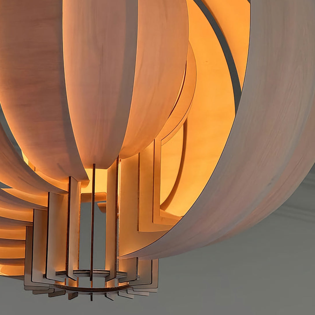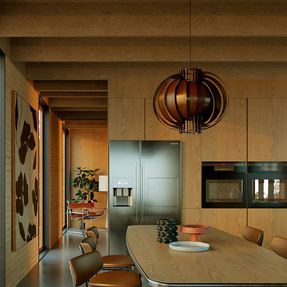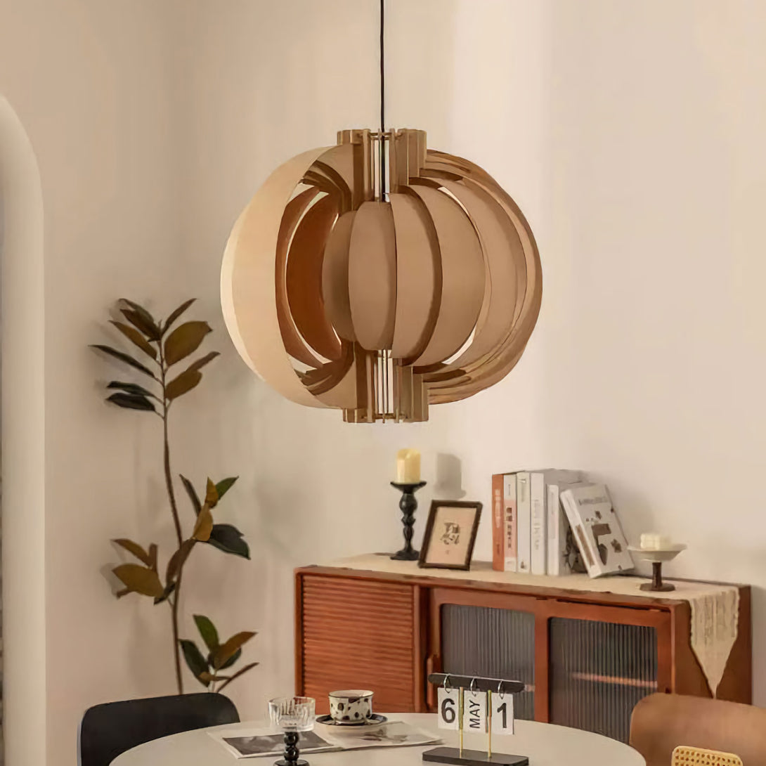 This elegant Wooden Lantern Pendant Lamp from korewolamp is a stunning example of minimalist design. The spherical shade is crafted from a series of curved, light wood slats that create an open, airy structure. When lit, the light filters through the gaps and the thin wood panels, casting a warm and inviting glow. The simple black canopy and cord provide a modern contrast to the natural wood tones. Its clean lines and natural materials make it a perfect fit for Scandinavian, minimalist, or contemporary interior styles.